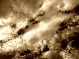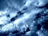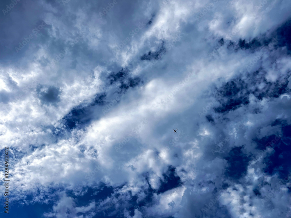 Fluffy clouds fill the sky while a small airplane travels through the blue expanse above. It is a bright day highlighting the contrast between the clouds and the azure background