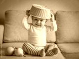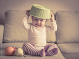 Funny baby plays with dish and fruit in home room, vintage style photo