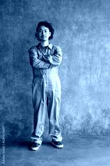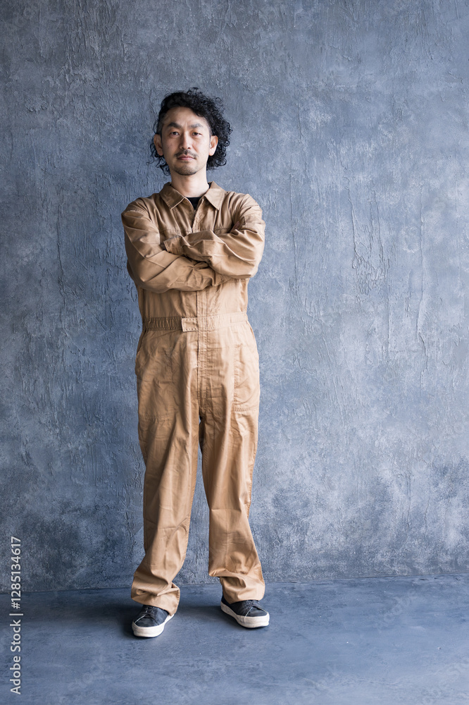 塗装業や内装業、diyの男性のイメージ カメラ目線の真剣な睨む顔のクローズアップ 腕を組む全身