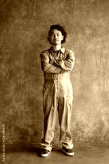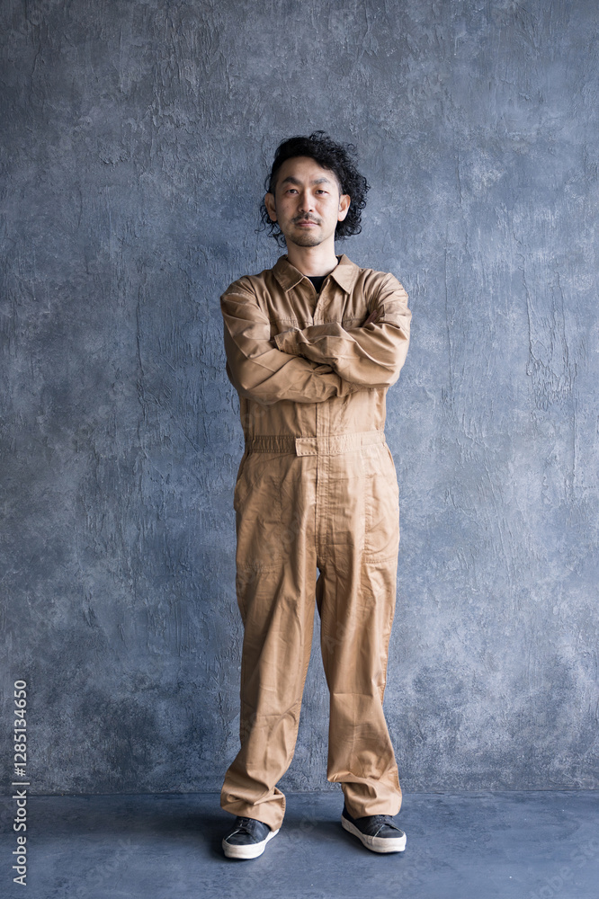 Full body of a man looking at the camera with his arms crossed in his work clothes inside a factory.