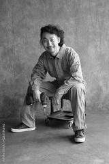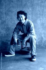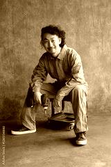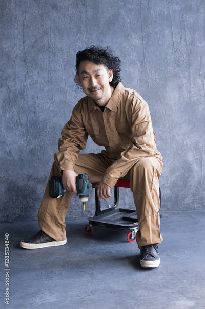 Man in construction work clothes with pupa work clothes holding electric screwdriver tool sitting on chair, looking at camera