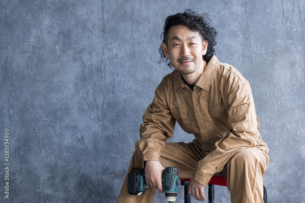イスに座る電動ドライバーの工具を持つツナギの作業着を着た建築業の男性 カメラ目線