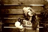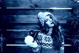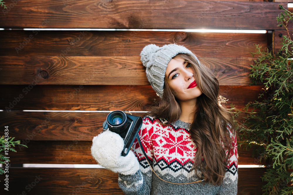 Portrait beautiful girl with red lips in knitted hat and gloves holding camera on wooden background