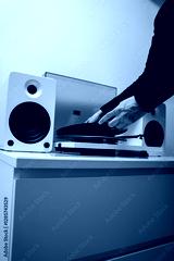 Setting up vinyl speaker system. Musicians hands adjusting vinyl disc on a needle player close-up.