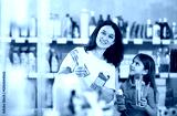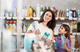 Adult woman and her daughter buyers choosing dental care products in household chemicals store