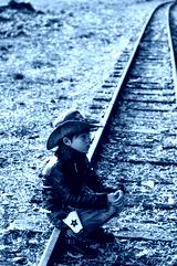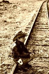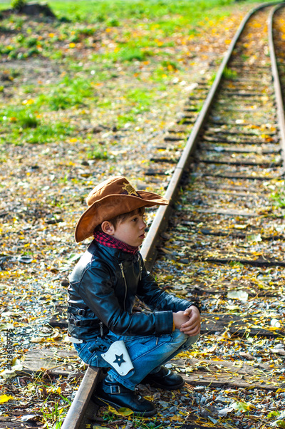 Boy in sheriff costume sitting on rails