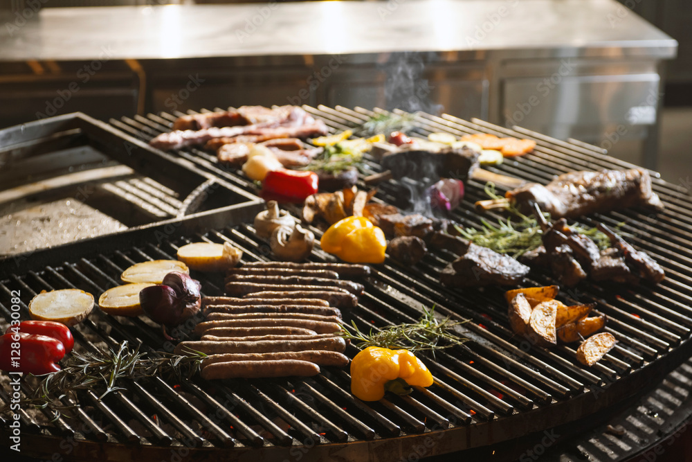 roasted meat and vegetables on the grill with flames and vegetables, close up