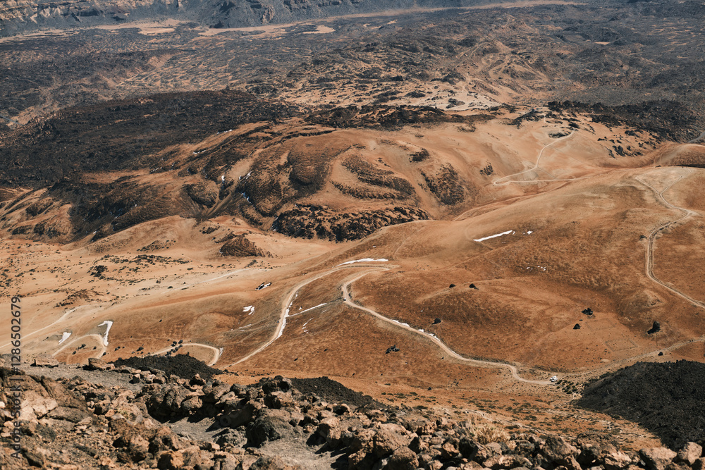 Aerial view of a winding road snaking through a desolate, mountainous landscape. Dry, rocky terrain stretches to the horizon under a bright sun. Perfect for travel, adventure, or geological projects.