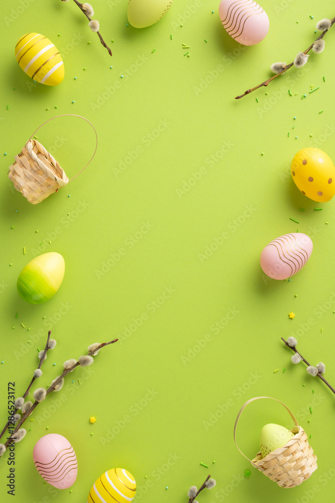 Easter vertical decorations including painted eggs, wicker baskets, and willow branches on a green surface