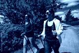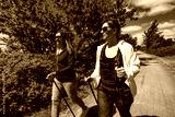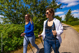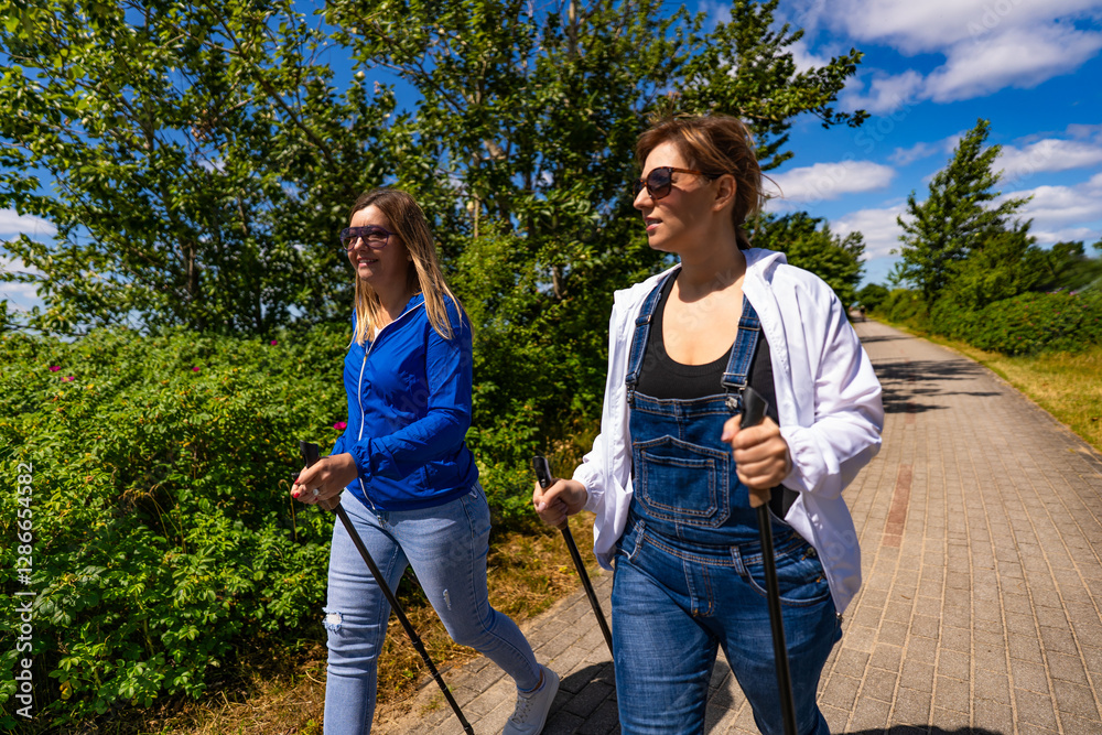 Nordic walking - two middle aged beautiful women exercising on sidewalk using Nordic walking poles in springtime