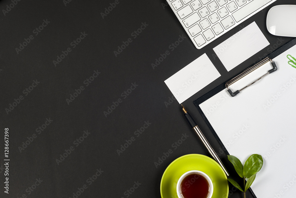 Office black desk table with white computer, supplies.