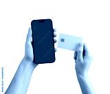 Female hand holding a blank smartphone, showcasing financial services, mobile payments, and shopping app. advertising promotions, cashback offers, and banking transaction. Isolated on white background