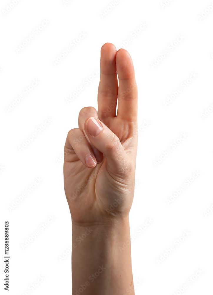 Female hand making a blessing gesture with index and middle fingers raised, symbolizing faith and spiritual expression. Gesture representing nonverbal communication and religious tradition. Isolated