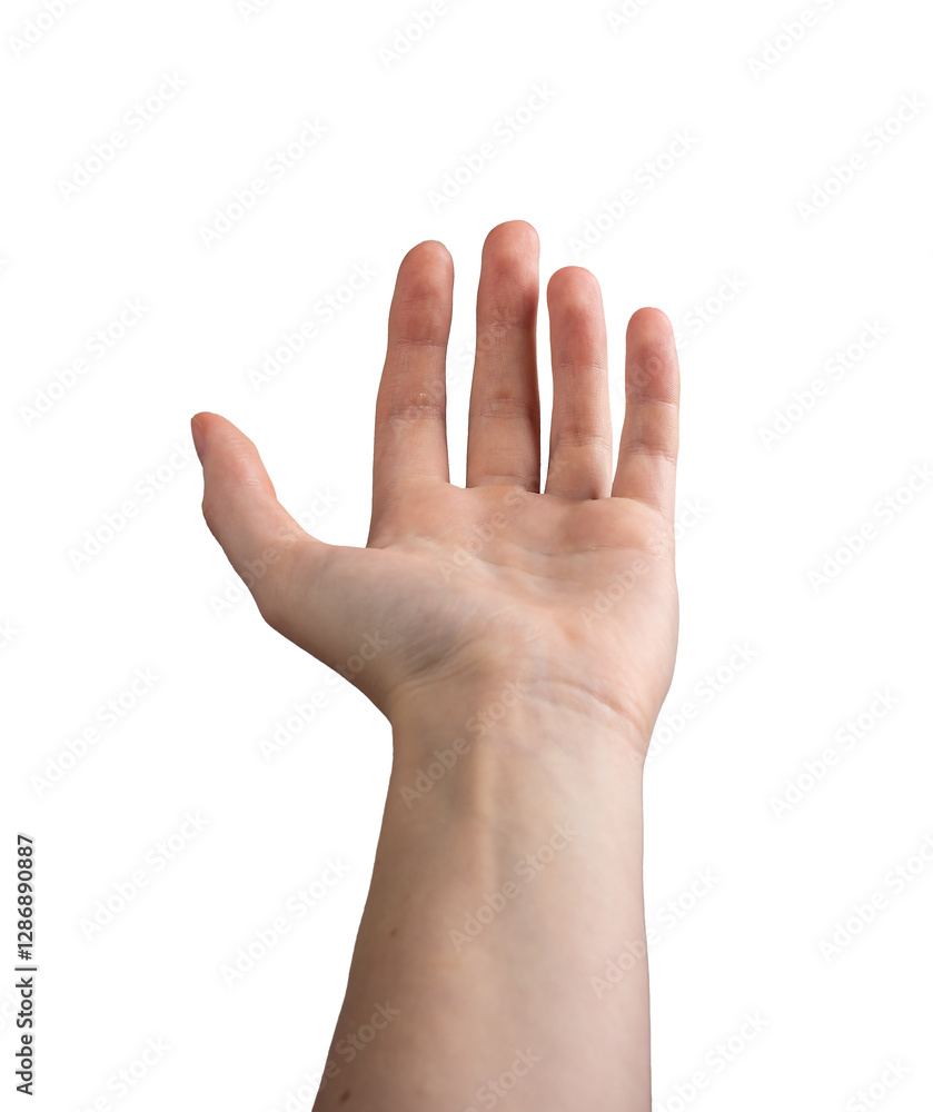 Female hand outstretched with a slightly curved palm, fingers extended in an inviting or requesting gesture. Symbolizing offering, asking for help, or seeking mercy. Isolated on white background.