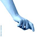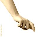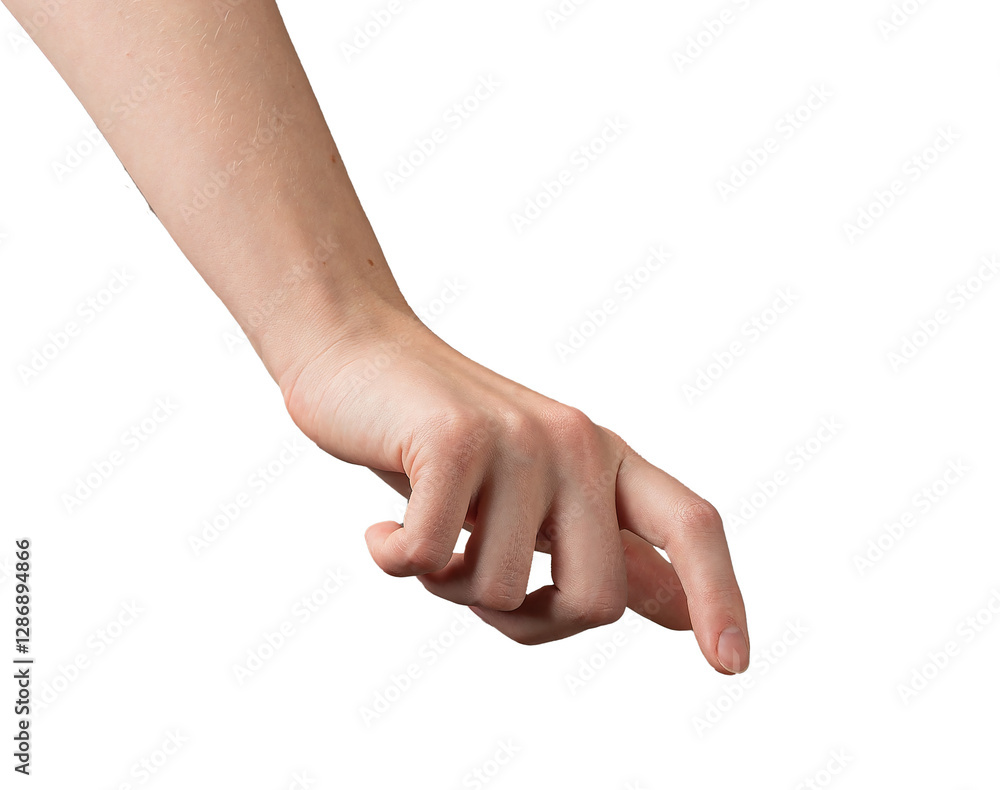 Female hand with index finger extended, reaching down as if pressing or selecting an invisible button. touchscreen interaction, decision-making, or digital selection. Isolated on white background.