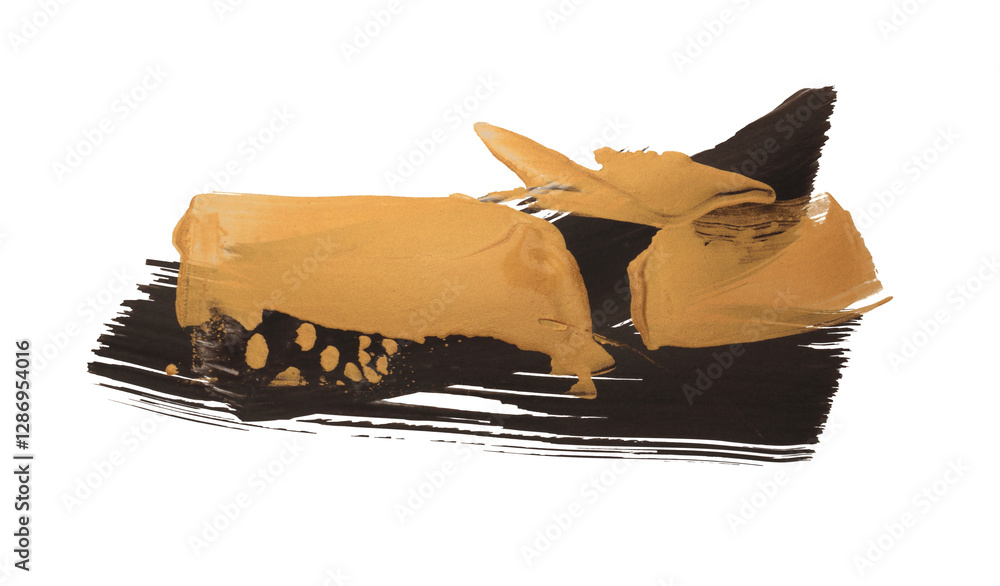 Art oil, Acrylic brush stroke smear painting blot. Abstract relief texture gold, bronze, black color stain isolated on white background.
