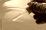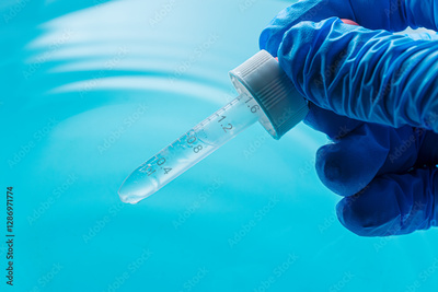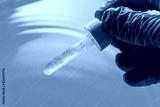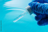 Close-up science experiments,Close up view macro shot of gel with different sized bubbles comes out from lab dropper into petri dish on blue background