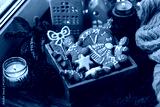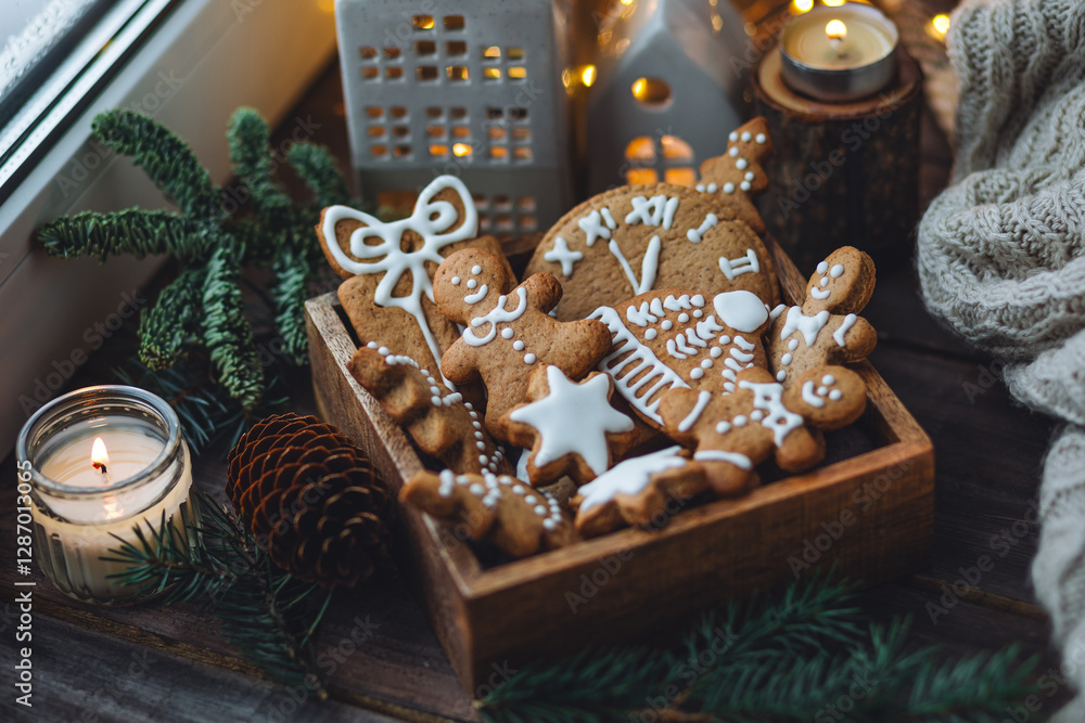 Handmade zero waste gift for Christmas or New Year. Wooden box with homemade delicious gingerbread cookies decorated with white icing. Cozy home atmosphere, fairy lights, fir tree branches