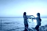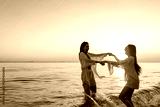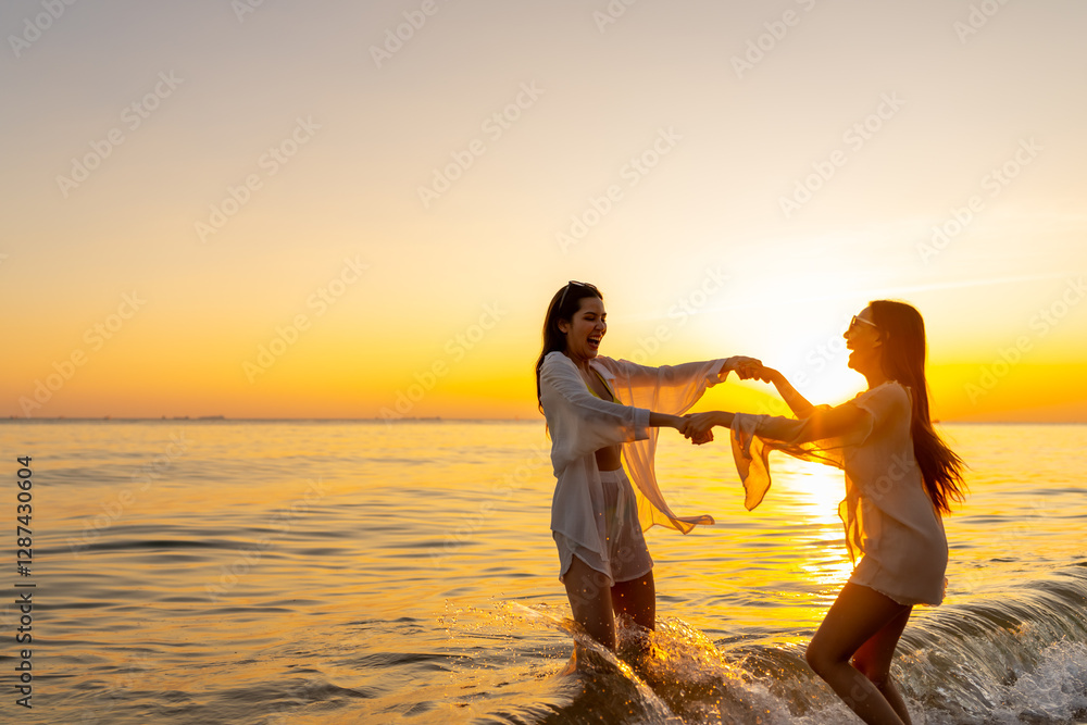 Happy woman travel nature ocean on summer beach holiday vacation. Group of Asian women friend enjoy and fun outdoor lifestyle dancing and playing in the sea together on tropical island beach at sunset