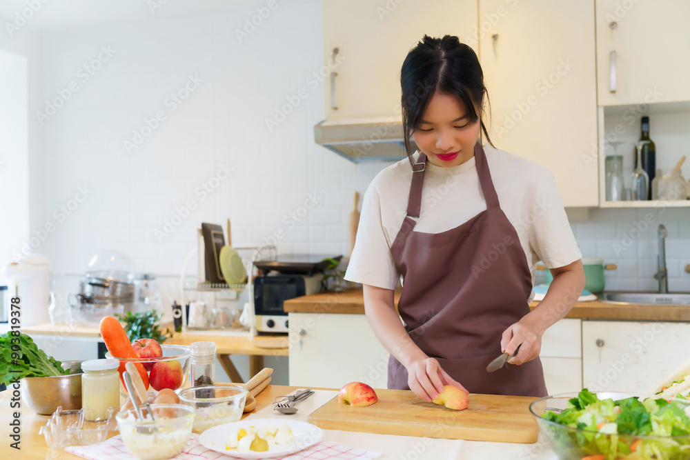 Young asian freelancer smiling while using her laptop, working remotely from a modern co-working space, enjoying the flexibility and increased productivity of remote work