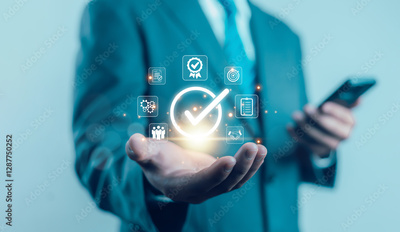 Hand shows sign of top service Quality assurance, Guarantee, Standards, ISO certification and standardization concept, satisfaction, service experience, show the standards of products and services.