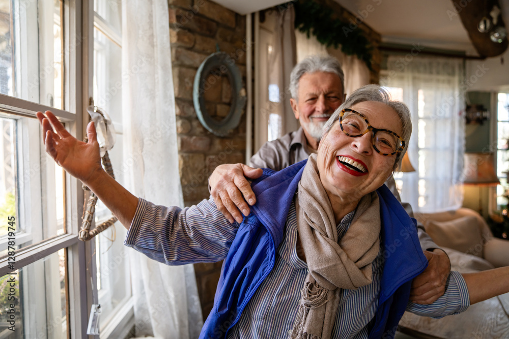 Happy mature woman dancing with her senior husband at home, active healthy senior couple