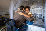 Family gathering, single father in wheelchair sharing love, hugging with diverse children at home