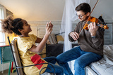 Music is so much fun. Young father teaching his little daughter to play violin and smiling.