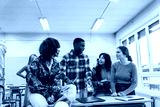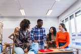 High school students collaborating on a project in classroom