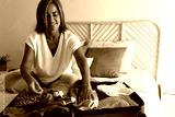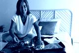 Mature woman sitting on bed packing suitcase for summer holidays abroad. Copy space.