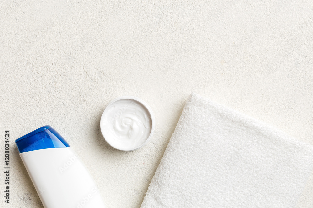 Cosmetic shampoo bottle mockup with towels on a colored table. Bathroom background, toilet accessories for hand and body care