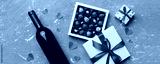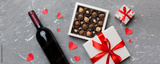 Bottle of red wine on colored background for Valentine Day with gift and chocolate. Heart shaped with gift box of chocolates top view with copy space