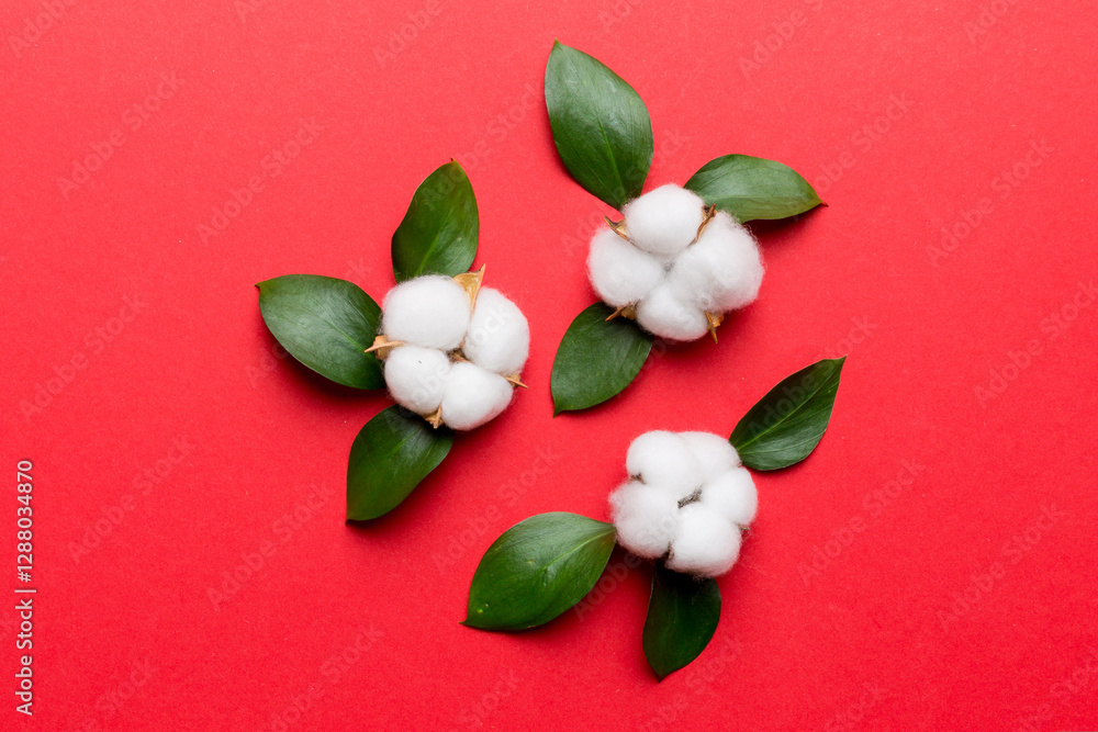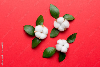 Autumn Floral Flat lay background composition. Dried white fluffy cotton flower branchwith green leaf top view on colored table with copy space