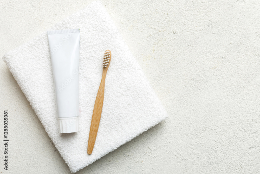 toothpaste and toothbrush top view with copy space on colored background. Flat lay. Dental hygiene. Oral care products on light background. Body care concept
