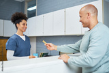 Friendly Dental Receptionist Assisting a Smiling Patient with Transaction at Clinic Front Desk