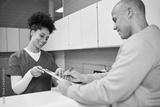 Smiling Healthcare Professional Assisting Patient with Forms at Reception Desk in Modern Clinic