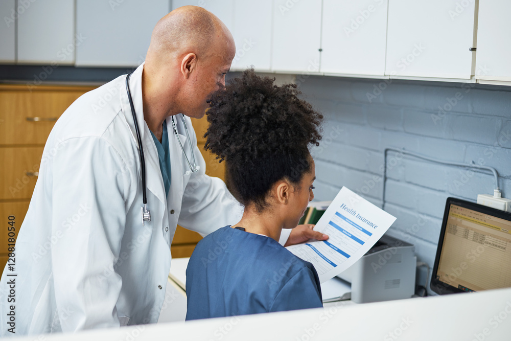 Doctor Discussing Health Insurance Options With Medical Staff in Office Setting