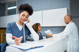 Healthcare Professionals Collaborating at a Clinic Reception Desk