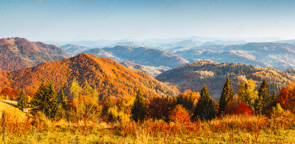 Majestic autumn panorama with multicolored wooded hills in soft sunlight. Carpathian mountains, Ukraine, Europe.