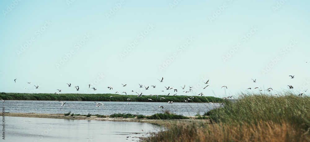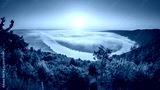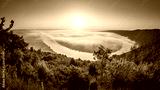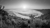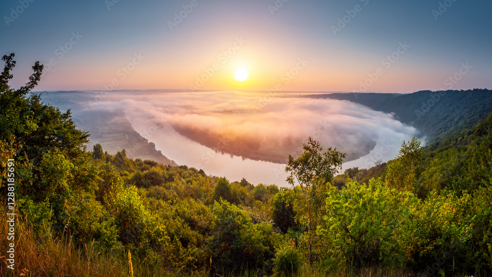 The bright morning sun rises over the fog-shrouded meander of the Dniester river. Location place Ukraine, Europe.
