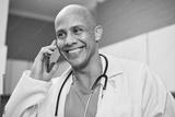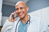 Smiling Medical Professional with Stethoscope Speaking on Phone in Clinic Setting