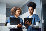 Two Healthcare Professionals Collaboratively Discussing Patient Information Using Tablet Devices in a Clinical Setting
