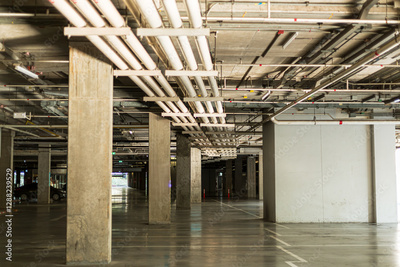 Underground parking lot,New underground parking road landscape,An empty underground parking lot of a shopping center or the interior of a garage with concrete columns.