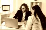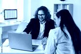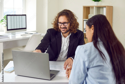 Business people at work in office. Two young smiling employees man and woman sitting at the desk with laptop having discussion, talking about new job projects or startups, analyzing company.