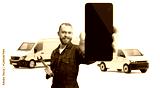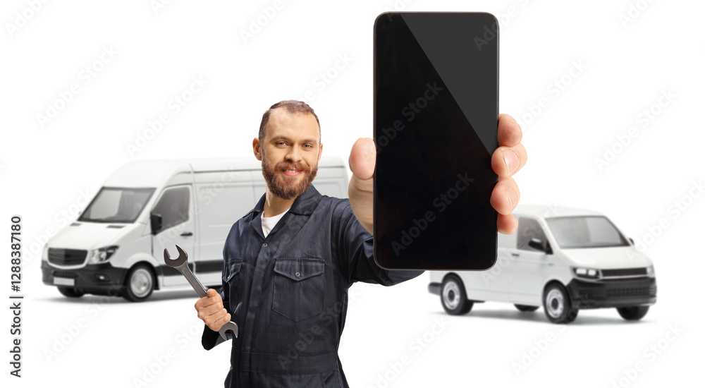 Mechnaic in a uniform with vans holding a wrench and a smartphone