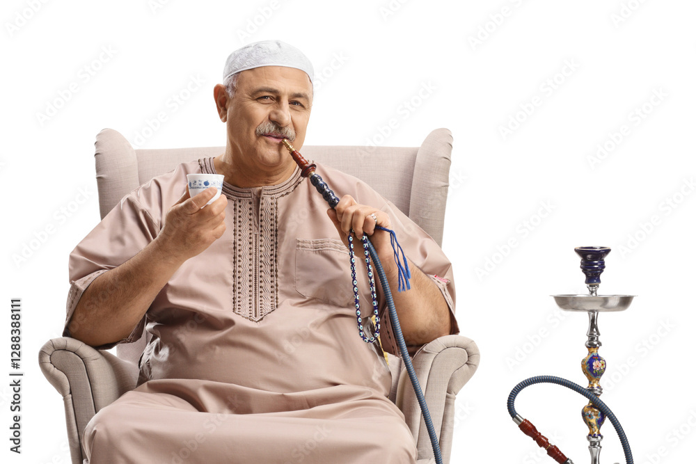 Man in ethnic clothes sitting in an armchair and smoking shisha