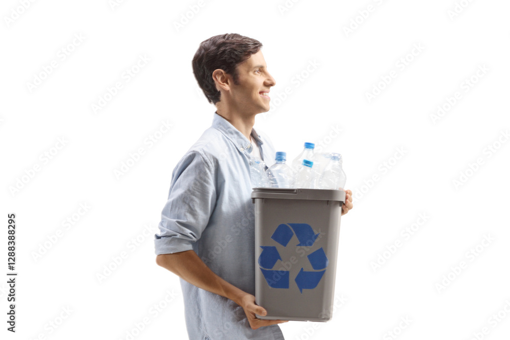 Young man carrying a recycling bin with plastic bottles