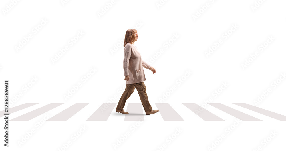 Full length profile shot of a mature woman walking on a pedestrian crossing