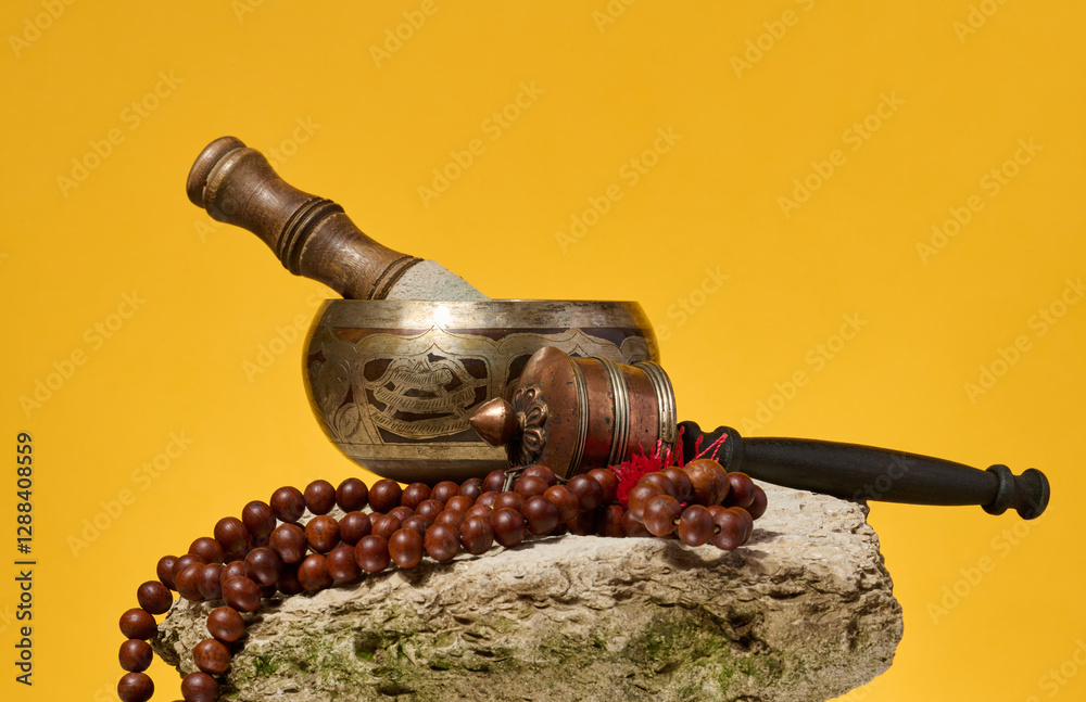 Copper singing bowl, wooden stick and prayer beads on stone, yellow background