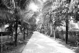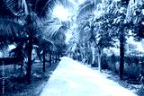 Coconut tree lined street tunnel along concrete pathway leading to lush greenery tropical fruit orchard and ecotourism local community, environmental and conservation travel in Can Tho, Vietnam
